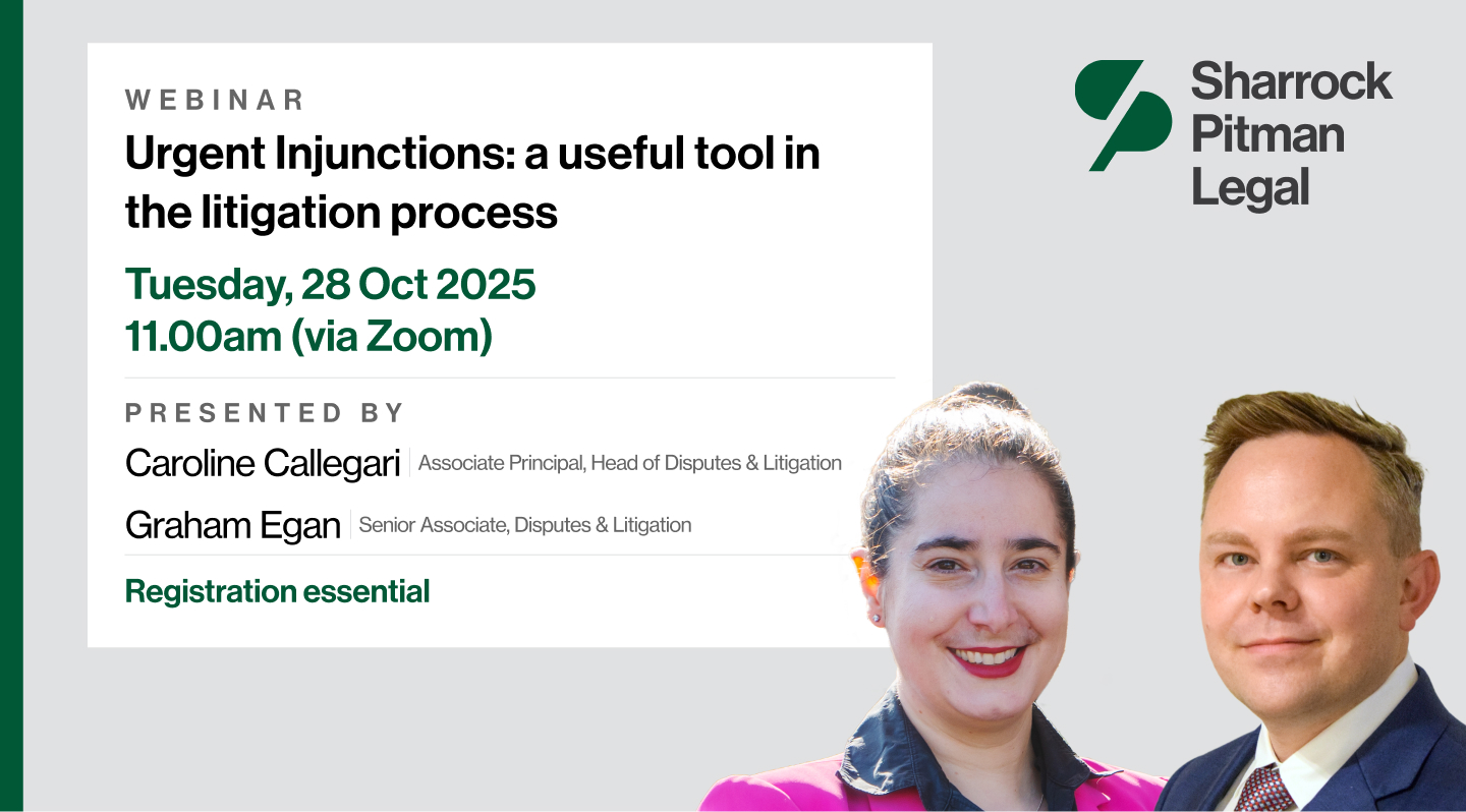 Many will know of the word 'injunction' but not when and why they are a useful tool in your armoury during the course of litigation. This webinar will focus on urgent injunctive relief – the kind that has you before the Court within 24-48 hours of a dispute arising to protect your interests and pending the final trial.